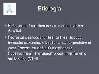 La enfermedad de Graves-Basedow es una enfermedad autoinmune que causa hipertiroidismo. Puede tratarse con medicamentos antitiroideos, yodo radiactivo, cirugía o una combinación de estos. Los síntomas incluyen oftalmopatía, bocio, taquicardia y dermopatía. El tratamiento adecuado puede controlar los síntomas y la enfermedad, aunque requiere seguimiento de por vida.