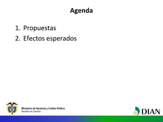 El documento presenta las propuestas de reforma tributaria del Ministerio de Hacienda y Crédito Público de Colombia para 2012. Las principales propuestas incluyen la introducción de un impuesto mínimo alternativo (IMAN) para personas naturales, la reducción de la tarifa del impuesto de renta de las empresas del 33% al 25% e introducir un nuevo impuesto del 8% llamado CREE. También se propone reducir los impuestos a la nómina a cargo de los empleadores y sustituir los aportes parafiscales de SENA e ICBF por