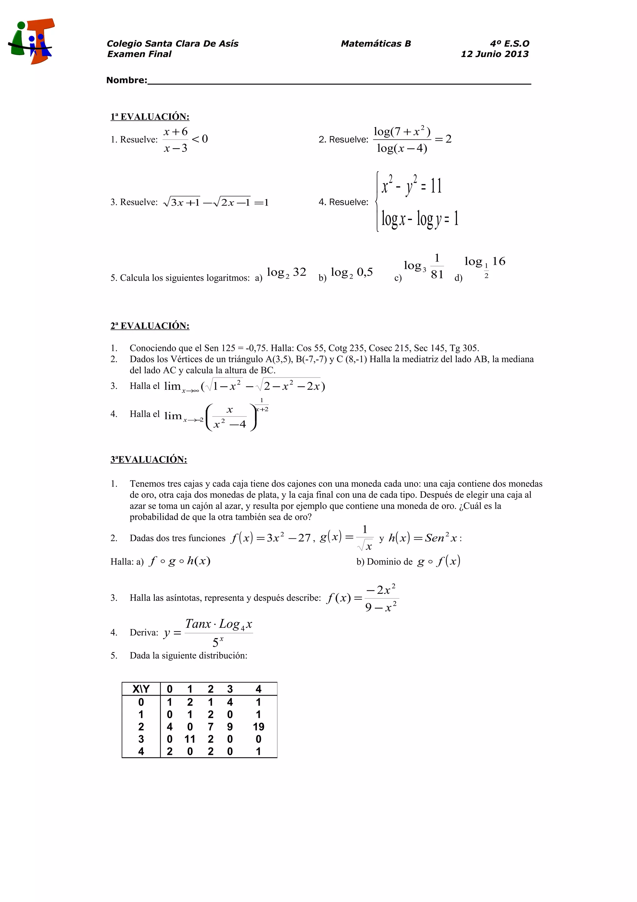 Este documento contiene un examen de matemáticas para 4o de ESO con 5 secciones. La primera sección incluye ejercicios de resolución de ecuaciones y logaritmos. La segunda sección incluye cálculos trigonométricos y geometría. La tercera sección incluye límites. La cuarta sección incluye probabilidad y funciones. La quinta sección analiza una distribución de datos para identificar valores atípicos y normalidad.