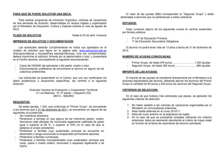 Este documento describe las becas disponibles para programas de inmersión lingüística en inglés durante las vacaciones de verano de 2012. Se ofrecen 2,200 becas, 1,320 para estudiantes en ciertas circunstancias desfavorecidas y 880 para otros estudiantes. Las solicitudes deben presentarse antes del 25 de abril incluyendo documentación justificativa y serán evaluadas según nota promedio, nota de inglés, asistencia previa al programa, y edad.