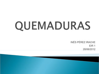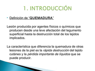 Este documento define una quemadura como una lesión de la piel producida por agentes físicos o químicos que van desde una leve afectación de la epidermis hasta la destrucción total de los tejidos. Describe los diferentes grados de quemaduras basados en la profundidad de la lesión, así como factores como la extensión, localización y gravedad que determinan el tratamiento y pronóstico. En resumen, clasifica las quemaduras, evalúa su gravedad y describe las medidas iniciales y tratamiento según el grado de la
