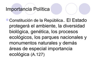 Este documento discute los problemas y amenazas que enfrentan las áreas protegidas en Venezuela. Señala que la Constitución y las leyes venezolanas establecen la importancia de proteger estas áreas, pero que en la práctica enfrentan desafíos como la deforestación, la construcción, la pesca y caza ilegales debido a la falta de cumplimiento de las leyes, vigilancia y aplicación de sanciones. Para resolver esto, propone mejorar la educación ambiental, la participación ciudadana, la gobernanza compartida de las áreas prote