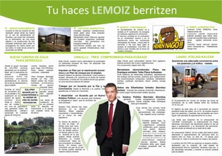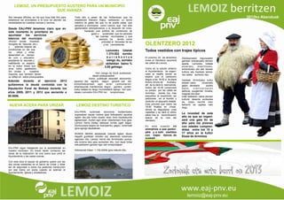El documento habla sobre varios proyectos y eventos en Lemoiz, incluyendo la construcción de una acera en Urizar, Lemoiz como destino turístico, el desfile de Olentzero el 24 de diciembre, y el presupuesto municipal para 2013 que incluye fondos para servicios básicos y mejoras culturales. También menciona obras de renovación de calles, saneamiento y abastecimiento de agua.