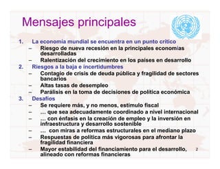 Este documento discute la situación y perspectivas de la economía mundial en 2012. Señala que la economía mundial se encuentra en un punto crítico con el riesgo de una nueva recesión en las principales economías desarrolladas y una desaceleración del crecimiento en los países en desarrollo. Expone varios riesgos como el contagio de la crisis de deuda pública y la fragilidad de los sectores bancarios. Finalmente, destaca los desafíos de implementar más estímulo fiscal coordinado a nivel internacional con énfasis