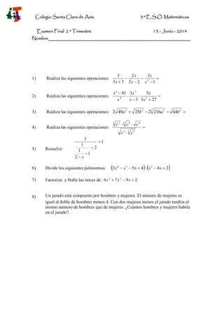 Este documento contiene un examen de matemáticas con 8 preguntas que incluyen operaciones aritméticas y algebraicas, resolución de ecuaciones, factorización de polinomios y un problema de proporcionalidad. El examen evalúa las habilidades básicas de los estudiantes en diferentes temas de álgebra.