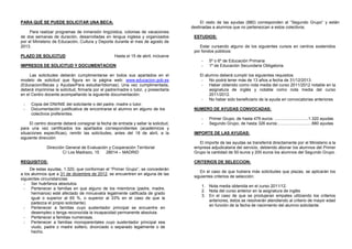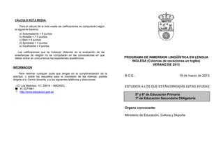 Este documento describe un programa de inmersión lingüística en inglés patrocinado por el Ministerio de Educación español. Se ofrecen 1,320 ayudas para estudiantes de bajos ingresos o con discapacidades para asistir a colonias de vacaciones de dos semanas en inglés en agosto de 2013. Otras 880 ayudas están disponibles para estudiantes de primaria y secundaria obligatoria con buen rendimiento académico.