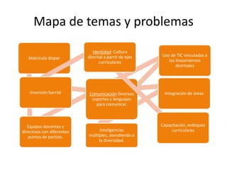Este documento presenta el proyecto educativo del Distrito Escolar 7mo para el año 2013. Los ejes de trabajo incluyen la inserción de las escuelas en la comunidad barrial, el agua como tema transversal en distintas áreas, y los 30 años de la vuelta a la democracia en Argentina. Se proponen capacitaciones docentes, proyectos pedagógicos articulados entre las escuelas, y actividades culturales para involucrar a la comunidad.