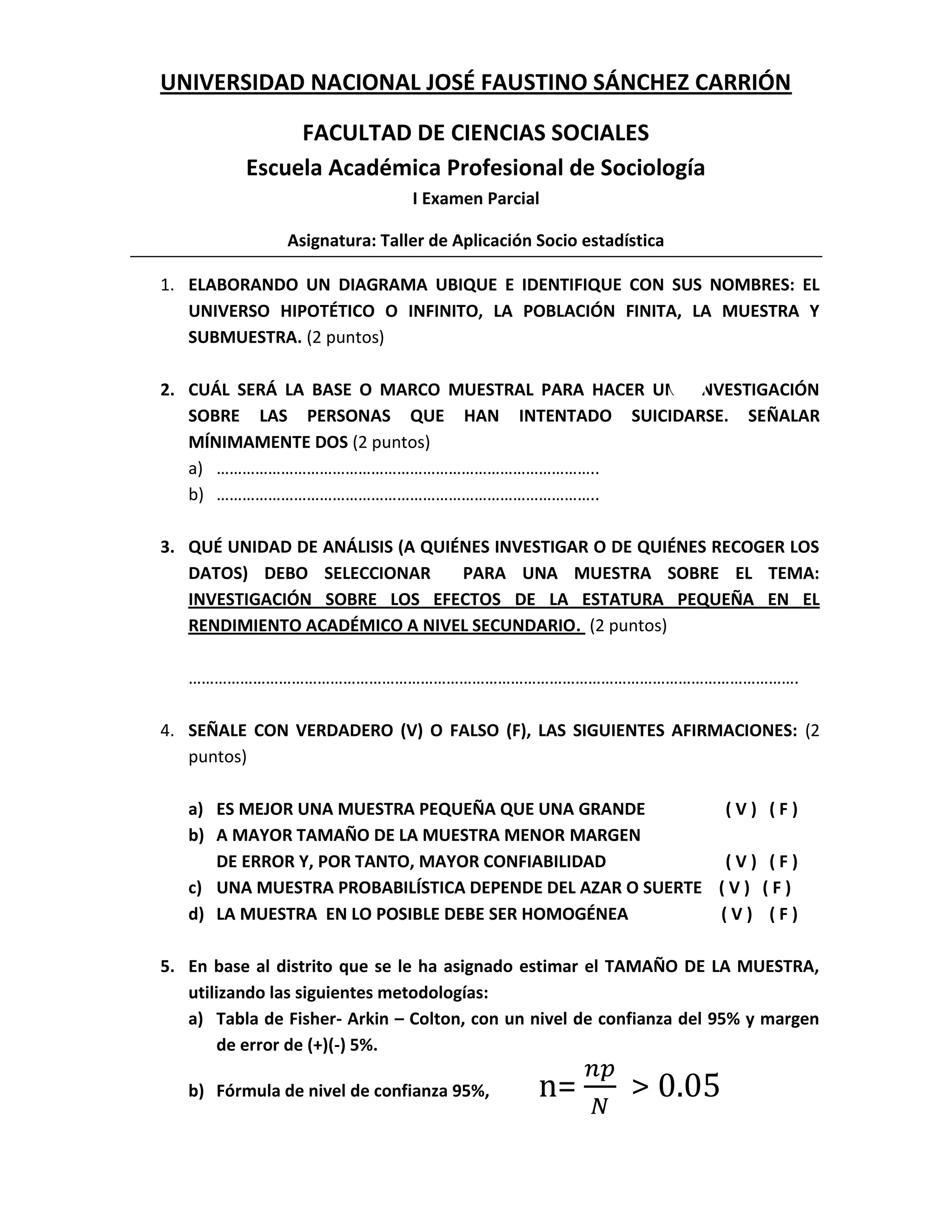 Este examen parcial evalúa conceptos estadísticos básicos como el universo, la población, la muestra y la submuestra. También incluye preguntas sobre cómo seleccionar una muestra representativa y calcular su tamaño apropiado usando diferentes fórmulas y tablas, así como dividir la muestra entre hombres y mujeres de manera proporcional. Finalmente, asigna distritos específicos a los estudiantes para que estimen el tamaño de la muestra en un ejercicio práctico.