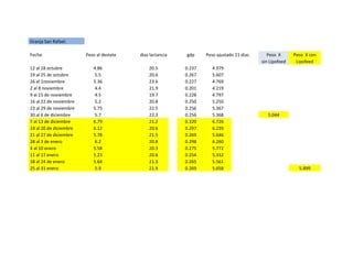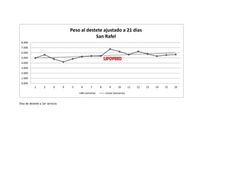 El documento presenta los datos de peso al destete ajustado a 21 días, días de destete al primer servicio y porcentaje de hembras cargadas en 7 días post destete de la granja San Rafael durante 16 periodos entre octubre y enero. Los pesos al destete ajustado fluctuaron entre 4.2 y 6.7 kg, los días de destete al primer servicio entre 2 y 15.5 días, y el porcentaje de hembras cargadas entre 41.7% y 100%.