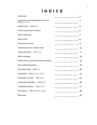 Este documento presenta varios temas relacionados con las matemáticas financieras, incluyendo el interés simple, interés compuesto, monto, valor presente, descuento simple y anualidades. Explica conceptos como capital, interés, tasa y tiempo. Incluye fórmulas y ejemplos para calcular intereses, montos, valores presentes y anualidades usando interés simple y compuesto.