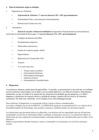 Este documento describe las demencias, incluyendo su definición, síntomas, tipos, diagnóstico y tratamiento. Las demencias son síndromes clínicos que implican deterioro intelectual y funcional, causados por daños cerebrales. Afectan principalmente a personas mayores. Los síntomas más comunes son problemas de memoria, orientación, lenguaje y habilidades complejas. Existen demencias degenerativas como la enfermedad de Alzheimer y demencias secundarias como la vascular. El diagnóstico implica evaluaciones neuropsicológicas y de