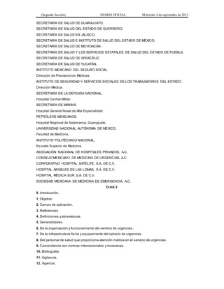 Este documento presenta la Norma Oficial Mexicana NOM-027-SSA3-2013, la cual establece los criterios de funcionamiento y atención en los servicios de urgencias de los establecimientos médicos. La norma describe los requisitos de infraestructura, equipamiento, personal y organización que deben cumplir los servicios de urgencias para brindar atención médica oportuna y de calidad. El documento especifica los procedimientos, manuales, capacitación del personal e instrumentos de control que se deben implementar para el adecuado funcion