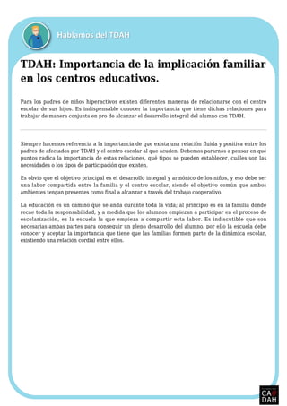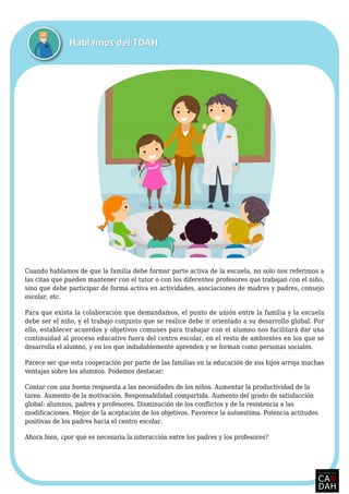 La implicación de las familias en los centros educativos es indispensable para trabajar de forma conjunta en pro del desarrollo integral de los alumnos con TDAH. Es necesaria una relación fluida entre las familias y la escuela, no solo a través de citas con tutores y profesores, sino también la participación activa de las familias en actividades y asociaciones del centro. Esta colaboración entre el hogar y la escuela tiene muchas ventajas para los alumnos, como una mejor respuesta a sus necesidades y un aumento de la motivación y satisfacción de todos
