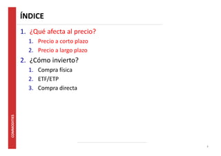 Este documento resume los factores que afectan al precio de las materias primas a corto y largo plazo, así como opciones para invertir en ellas. A corto plazo, el precio depende de la oferta y demanda actual y noticias recientes, mientras que a largo plazo depende de las previsiones de oferta y demanda futuras y del desarrollo de nuevos proyectos para satisfacer la demanda. Se explican ejemplos como el hierro y el cobre.
