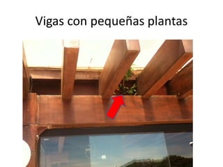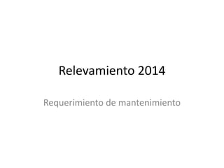 El documento presenta un relevamiento de los requerimientos de mantenimiento de varias áreas y estructuras, identificando numerosas rajaduras, goteras, deterioros y presencia de plagas en vigas, entablonados, pisos, maderas, hormigón y otros elementos. Se detectan problemas en techos, sistemas eléctricos e iluminación, y se recomienda realizar tareas de limpieza, aplicación de productos protectores, reparaciones y reemplazos para resolver las deficiencias encontradas.