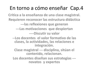 Este documento discute diferentes estrategias para mejorar la enseñanza y la innovación educativa. Critica las clases magistrales y propone enfoques más participativos como proyectos, talleres y la integración de temas a través de casos y trabajos grupales. También destaca la importancia de hacer el aprendizaje más significativo a través de la narración, las preguntas provocativas y la estimulación de las emociones.