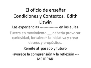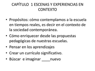 Este documento discute varios temas relacionados con la enseñanza, incluyendo la importancia de considerar el contexto social y las experiencias de los estudiantes, analizar las prácticas docentes desde nuevos marcos interpretativos, y pensar en formas de favorecer los aprendizajes significativos a través de actividades atractivas y un clima positivo en el aula.