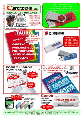 Este documento es un catálogo de una papelería que ofrece material escolar. Incluye precios de libros de texto, cuadernos, bolígrafos, lápices, colores, cartulinas y otros útiles escolares. También tiene ofertas como un 10% de descuento para la compra de más de 10 libros de texto o un regalo por compras superiores a determinadas cantidades.