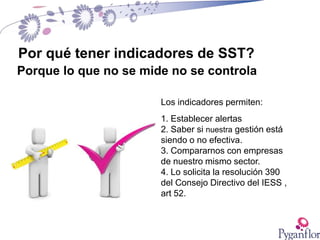 El documento explica tres índices reactivos relacionados con la seguridad y salud ocupacional que solicita la resolución 390 del Consejo Directivo del IESS: el índice de frecuencia, el índice de gravedad y la tasa de riesgo. Estos índices miden accidentes, días perdidos y la relación entre gravedad y frecuencia, respectivamente, y se calculan en relación a 200,000 horas hombre trabajadas. El documento proporciona ejemplos detallados del cálculo de cada índice.