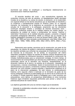 Este documento presenta la planificación del curso Pedagogía I del año lectivo 2014 en la Facultad de Humanidades y Ciencias de la Educación de la Universidad Nacional de La Plata. El curso es dictado por la profesora Luciana Garatte y tiene como objetivos que los estudiantes adquieran una perspectiva histórica y comprensiva de la pedagogía, conozcan las diferentes corrientes pedagógicas y se aproximen al enfoque epistemológico de la disciplina. Los contenidos se estructuran en torno a temas como
