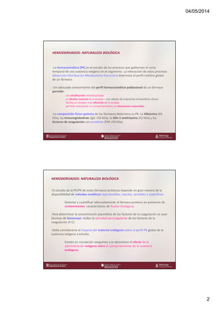 Este documento discute las características cinéticas de los principales hemoderivados y su importancia clínica para la individualización terapéutica. Explica que la farmacocinética de estos fármacos proteicos depende de métodos analíticos precisos para su detección y cuantificación. También analiza la influencia de factores como la edad, el peso y la obesidad en la farmacocinética de los factores de la coagulación, señalando que el aclaramiento y la vida media tienden a disminuir con