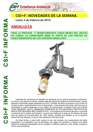 Este documento proporciona un resumen de las principales noticias de la semana relacionadas con la educación en Andalucía. Informa que la Consejería de Educación ha desbloqueado 20 millones de euros para los gastos de funcionamiento de 1.500 centros educativos. También resume las novedades sobre las oposiciones de 2014, incluyendo el aumento del número total de plazas. Por último, resume el plan de choque para cubrir 840 puestos de monitor escolar en 600 municipios andaluces.