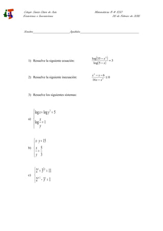 El documento presenta 5 problemas matemáticos de ecuaciones y sistemas de ecuaciones para resolver: 1) Resolver una ecuación logarítmica, 2) Resolver una inecuación, 3) Resolver 5 sistemas de ecuaciones que incluyen ecuaciones logarítmicas, multiplicativas y lineales. El estudiante debe mostrar los pasos para resolver cada problema.