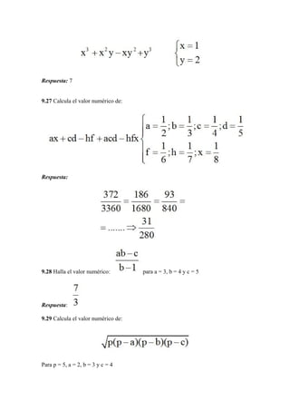 El primer documento explica cómo calcular el valor numérico de una expresión algebraica mediante la sustitución de números por letras de acuerdo a la expresión. El segundo documento describe la fórmula para calcular el cuadrado de la suma o diferencia de dos cantidades. El tercer documento define una función matemática y explica conceptos como dominio, codominio y recorrido.
