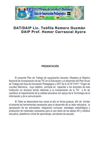 Este plan de capacitación docente tiene como objetivo capacitar a los maestros de la Institución Educativa No 21011 "Virgen de Lourdes" en el uso de tecnologías educativas como plataformas virtuales de aprendizaje, laptops XO, robótica educativa y herramientas de autor. El plan consiste en tres talleres anuales que cubrirán temas como el uso de PerúEduca, actividades con laptops XO, integración de robótica en clases y creación de recursos educativos. El plan busca mejorar la