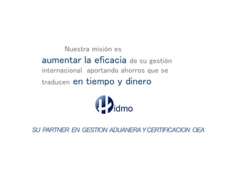 Este documento presenta los servicios de una empresa de gestión aduanera y certificación de Operador Económico Autorizado. La empresa ofrece asesoramiento personalizado, soluciones a medida y herramientas digitales para ayudar a las empresas a optimizar su gestión internacional y acceder a mercados externos de forma eficiente. También proporciona formación y guías para ayudar a las empresas a obtener la certificación de Operador Económico Autorizado.