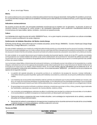 El documento presenta el proyecto educativo de una unidad educativa. Explica que se basa en la refundación del Estado plurinacional y la construcción de un Estado comunitario. Su objetivo es implementar una educación descolonizadora, comunitaria y productiva que forme personas íntegras. Busca establecer confianza con la comunidad educativa para fortalecer la autoestima y habilidades de los estudiantes. Su diagnóstico muestra debilidades como falta de capacitación docente y recursos, y propone objetivos como mejorar la calidad educativa y