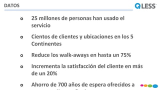 QLess es una solución de gestión de colas que permite a los clientes registrarse y gestionar su tiempo de espera de forma remota a través de diferentes canales como SMS, aplicaciones móviles o kioscos. Esto reduce los tiempos de espera, mejora la satisfacción del cliente y la eficiencia operativa de las empresas al proporcionar información en tiempo real sobre los procesos.