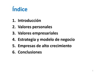 Este documento presenta las claves para que las empresas sobrevivan y crezcan de forma exitosa. Analiza estudios sobre empresas de alto crecimiento en España y destaca la importancia de los valores personales y empresariales como la innovación, la internacionalización y las finanzas prudentes. También examina factores como la estrategia, el modelo de negocio y casos concretos que ilustran cómo empresas han logrado el éxito a través de la adaptación, la profesionalización y el liderazgo.