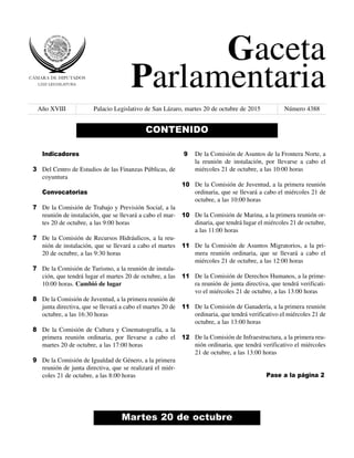 Este documento contiene una serie de convocatorias y anuncios de reuniones de varias comisiones de la Cámara de Diputados de México para la semana del 20 de octubre de 2015. Incluye el orden del día y la información relevante para las reuniones de instalación y ordinarias de comisiones como Trabajo y Previsión Social, Recursos Hidráulicos, Turismo, Juventud, Cultura y Cinematografía, e Igualdad de Género.