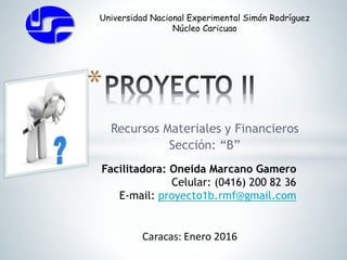 Este documento presenta la información sobre un curso de Proyecto II que se llevará a cabo en la Universidad Nacional Experimental Simón Rodríguez. Incluye detalles sobre la facilitadora, el contenido del curso organizado en unidades temáticas, la metodología, el cronograma de actividades y la forma de evaluación. El objetivo del curso es enseñar a los estudiantes a desarrollar un proyecto de investigación mediante diferentes talleres y discusiones sobre temas como tipos de investigación, diseños, recolección de datos y anális