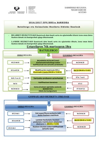 Este documento proporciona información sobre el proceso de admisión a la UPV/EHU para el curso 2016/2017 para estudiantes de bachillerato y ciclos formativos de grado superior. Detalla las fechas para la incorporación de datos personales y preinscripción de los estudiantes, la realización de las pruebas de acceso, la entrega de calificaciones y la matrícula. Asimismo, especifica los plazos para modificar la matrícula en la convocatoria ordinaria y extraordinaria.