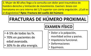 2. La paciente de 80 años llega con dolor y limitación de movimiento en el hombro derecho tras un trauma. Al examen se observa un hematoma en el hombro con cierta angulación, lo que indica una fractura del cuello del húmero.