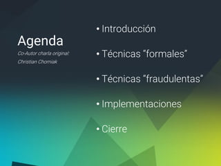 El documento aborda varias técnicas de inteligencia artificial aplicadas en el desarrollo de juegos, incluyendo métodos formales y fraudulentos para crear comportamientos realistas en personajes. Se discuten problemas como el desplazamiento inteligente y la toma de decisiones, así como la interacción entre agentes y la estrategia de vigilancia. Se concluye que la elección de la técnica adecuada depende del tipo de problema y que a menudo las soluciones más simples son las más efectivas.