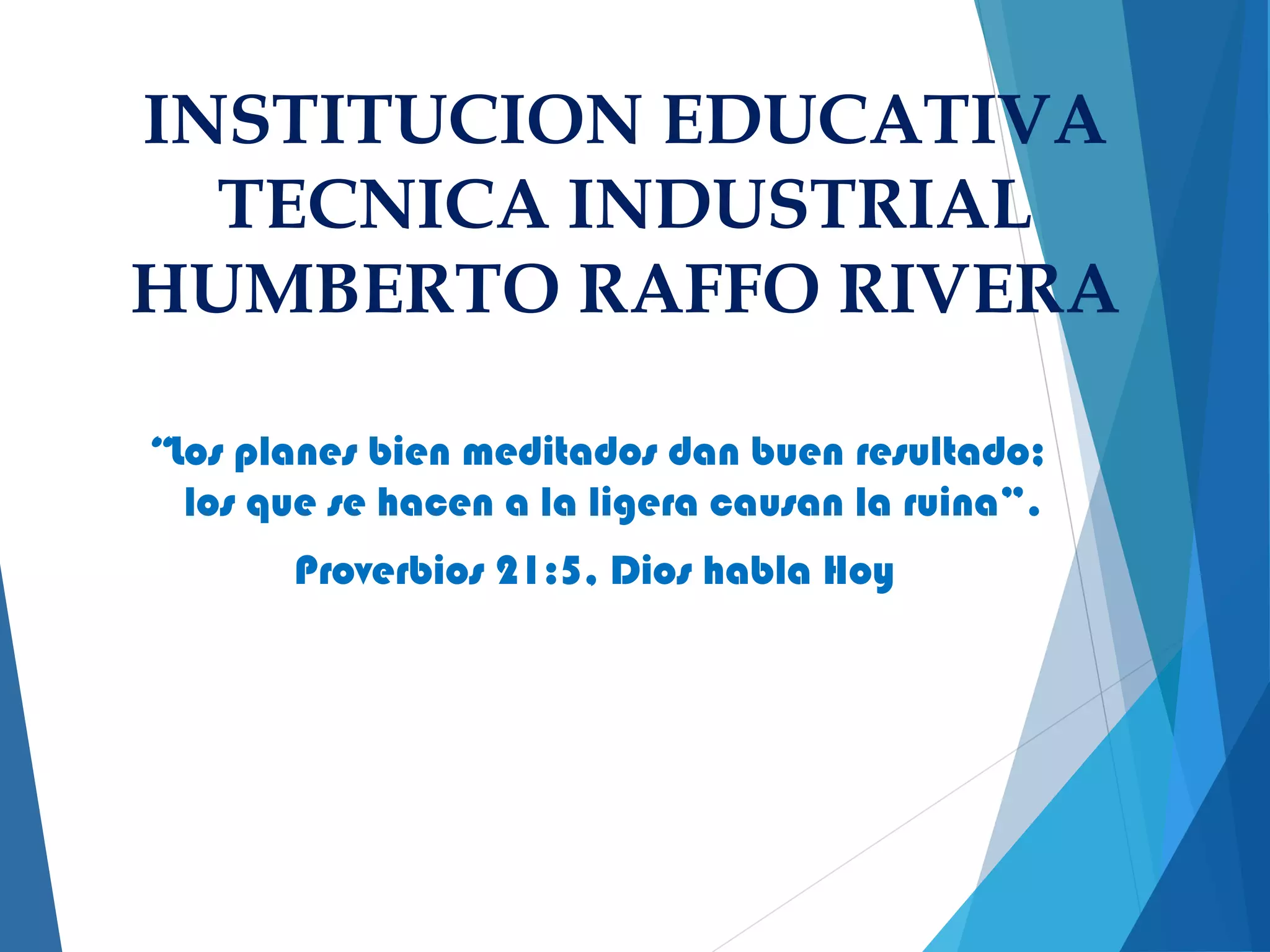 Este documento resume el informe de gestión de 2016 de la Institución Educativa Técnica Industrial Humberto Raffo Rivera. Los ingresos han disminuido los últimos años debido a la reducción en el número de estudiantes. En 2016, los ingresos principales provinieron de transferencias (96%), mientras que los gastos se destinaron principalmente a inversiones (77%), como la adquisición de equipos para talleres y la mejora de la infraestructura física. El balance financiero al final de año arrojó un saldo disponible de $13.888.