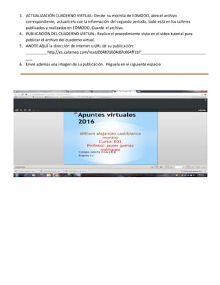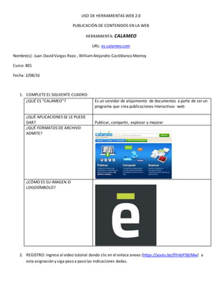 El documento describe la herramienta web Calameo, que permite publicar y compartir documentos de forma interactiva en la web. Calameo admite varios formatos de archivo y puede usarse para publicar, compartir y mejorar contenidos. El documento instruye a los estudiantes a registrarse en Calameo, actualizar su cuaderno virtual con información recopilada y publicar el cuaderno en Calameo, proporcionando al final la URL de su publicación.