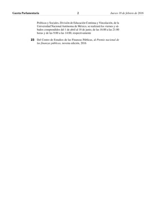 El documento es una gaceta parlamentaria que contiene información sobre diversas convocatorias y reuniones de comisiones en el Congreso de la Unión, así como comunicaciones oficiales remitidas sobre temas presupuestales, de participaciones federales a estados, y contestaciones a puntos de acuerdo. También incluye iniciativas presentadas por diputados sobre temas de educación e igualdad de género.