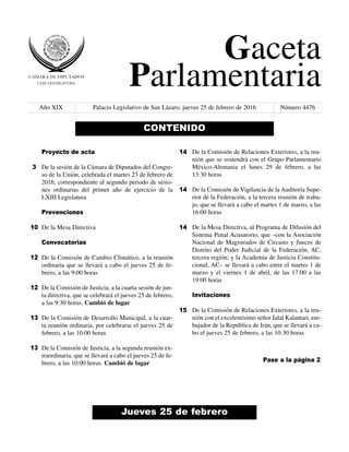 Este documento es una gaceta parlamentaria que contiene información sobre las actividades y sesiones de la Cámara de Diputados de México. Incluye el acta de una sesión, convocatorias y anuncios de varias comisiones, y comunicaciones oficiales remitidas a la Cámara de Diputados por diferentes dependencias gubernamentales.