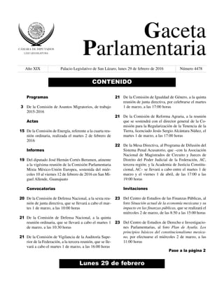 Este documento presenta el programa de la Comisión de Asuntos Migratorios, de Trabajo para el periodo 2015-2016. Resume el contexto de la migración a nivel global y en México, así como la legislación y política migratoria mexicana. Señala retos en la coordinación interinstitucional y la participación de la sociedad civil, además de proponer fortalecer la rendición de cuentas y monitoreo del Instituto Nacional de Migración.