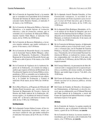 Este documento es una gaceta parlamentaria que contiene información sobre las actividades y reuniones de varias comisiones del Congreso de México. Incluye comunicados de la Junta de Coordinación Política sobre cambios en la integración de algunas comisiones, actas de reuniones previas de comisiones, informes, convocatorias a próximas reuniones de comisiones, invitaciones a foros y eventos, y avisos sobre cambios en el programa de algunas comisiones.