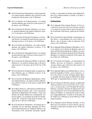 Este documento contiene una serie de convocatorias y anuncios de reuniones de comisiones de la Cámara de Diputados del Congreso de la Unión para el 30 de marzo de 2016 y días posteriores. También incluye invitaciones a foros y eventos relacionados con temas como derechos humanos, energía, agua potable, y seguridad social. Finalmente, presenta modificaciones a los turnos de iniciativas legislativas y una solicitud para retirar una iniciativa de la orden del día de una comisión.