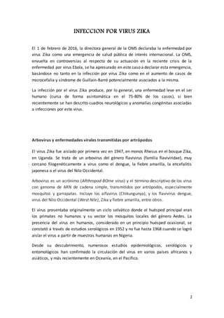 El documento detalla la infección por virus Zika, identificando su origen, modos de transmisión y complicaciones potenciales, incluyendo microcefalia y síndrome de Guillain-Barré. Se reporta el incremento de casos en América Latina desde 2015, así como la respuesta de la OMS ante este brote de salud pública. Además, se abordan temas de diagnóstico, tratamiento y prevención, resaltando la importancia de medidas específicas para la población vulnerable, especialmente mujeres embarazadas.