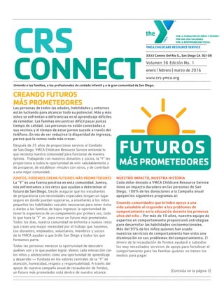 El documento proporciona información sobre los programas y servicios de YMCA Childcare Resource Service (CRS). CRS trabaja para crear futuros más prometedores para los niños y familias de San Diego al ofrecer programas de cuidado infantil de alta calidad, campamentos de verano subsidiados, y servicios de apoyo conductual. Los fondos recaudados a través de la campaña anual apoyan estos programas que tienen un impacto positivo duradero en la comunidad.