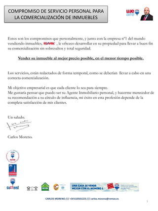Este documento detalla los servicios y compromisos de un agente inmobiliario para comercializar una propiedad. En menos de 6 secciones, describe el proceso completo que incluye valorar la propiedad, preparar materiales de marketing, mostrarla a clientes potenciales, negociar ofertas y completar la venta en la notaría. El agente promete mantener al propietario informado a lo largo del proceso y asegurar la máxima satisfacción.