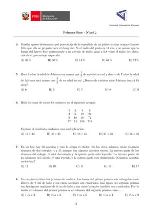 Este documento presenta la primera fase de la XIV Olimpiada Nacional Escolar de Matemática de Perú de 2017 para el nivel 2. Contiene 20 preguntas de opción múltiple sobre diferentes temas matemáticos, así como las instrucciones para la prueba que indican que dura 2 horas y no se permite el uso de calculadoras u otros materiales.