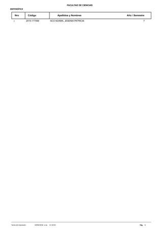 Este documento contiene listados de estudiantes de diferentes facultades y carreras de la Universidad Nacional Jorge Basadre Grohmann en Tacna, Perú. Se incluyen los nombres, códigos de identificación, años y semestres de cada estudiante.